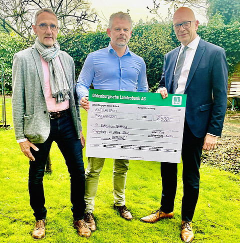 Cloppenburg/Vechta. Der Lionsclub Cloppenburg-Soeste unterstützt das Engagement der Schwester-Euthymia-Stiftung für die medizinische Versorgung der Menschen in der Ukraine: Vizepräsident Dr. Jan Bookjans und Fördergesellschaftsvorsitzender Klaus-Peter Schultz übergaben dazu einen Scheck über 2500 Euro an Ulrich Pelster, Vorstand der Schwester-Euthymia-Stiftung.